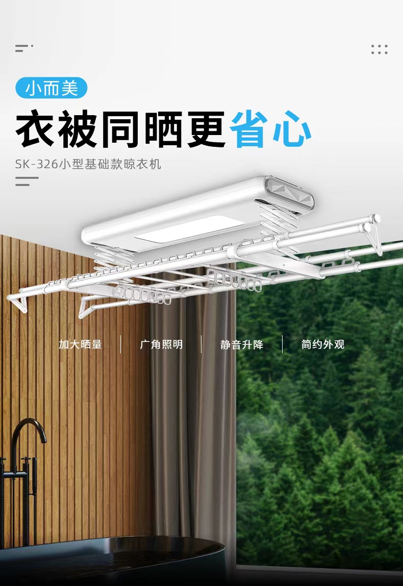 多功能智能晾衣机SK-327,晾衣、烘干、消毒、晾被、风干、照明,一机六用,为织物护理提供全方位细致化服务。